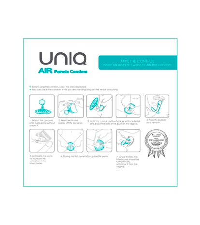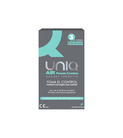 Condon Femenino Uniq, elaborado en resina sintética, lubricado; tiene una burbuja de aire que actúa como mecanismo de retención interna y facilita su inserción; con arandela en la base para mayor protección.
