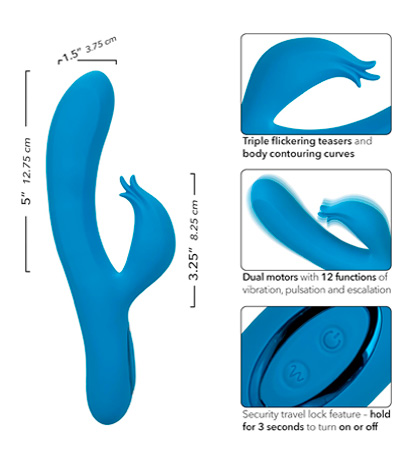- Potente masajeador de doble motor con triple parpadeo y curvas de contorno corporal.